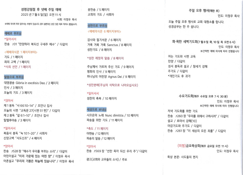 2025년 7월 6일 주보 작성자 정보 담임목사 작성 작성일 2025.07.09 13:50 컨텐츠 정보 715 조회 목록 본문 성령강림일 후 넷째 주일 SNS 공유 관련자료 이전 2025년 7월 13일 주보 작성일 2025.07.16 16:14 다음 2025년 6월 29일 주보 작성일 2025.07.01 15:56 댓글 0 등록된 댓글이 없습니다. 로그인한 회원만 댓글 등록이 가능합니다. 목록
