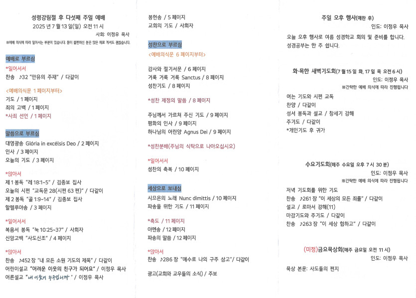 2025년 7월 13일 주보 작성자 정보 담임목사 작성 작성일 2025.07.16 16:14 컨텐츠 정보 681 조회 목록 본문 성령강림일 후 다섯째 주일 SNS 공유 관련자료 이전 2025년 7월 20일 주보 작성일 2025.07.23 13:32 다음 2025년 7월 6일 주보 작성일 2025.07.09 13:50 댓글 0 등록된 댓글이 없습니다. 로그인한 회원만 댓글 등록이 가능합니다. 목록