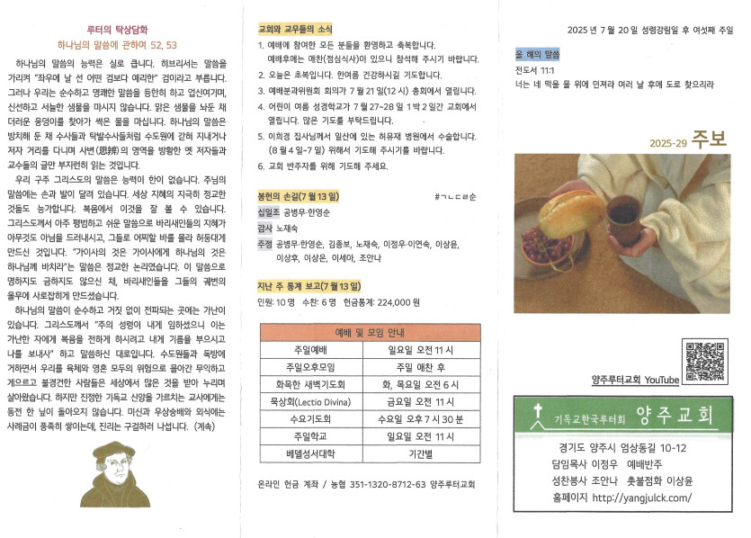 2025년 7월 20일 주보 작성자 정보 담임목사 작성 작성일 2025.07.23 13:32 컨텐츠 정보 745 조회 목록 본문 성령강림일 후 여섯째 주일 SNS 공유 관련자료 이전 2025년 7월 27일 주보 작성일 2025.08.03 22:29 다음 2025년 7월 13일 주보 작성일 2025.07.16 16:14 댓글 0 등록된 댓글이 없습니다. 로그인한 회원만 댓글 등록이 가능합니다. 목록