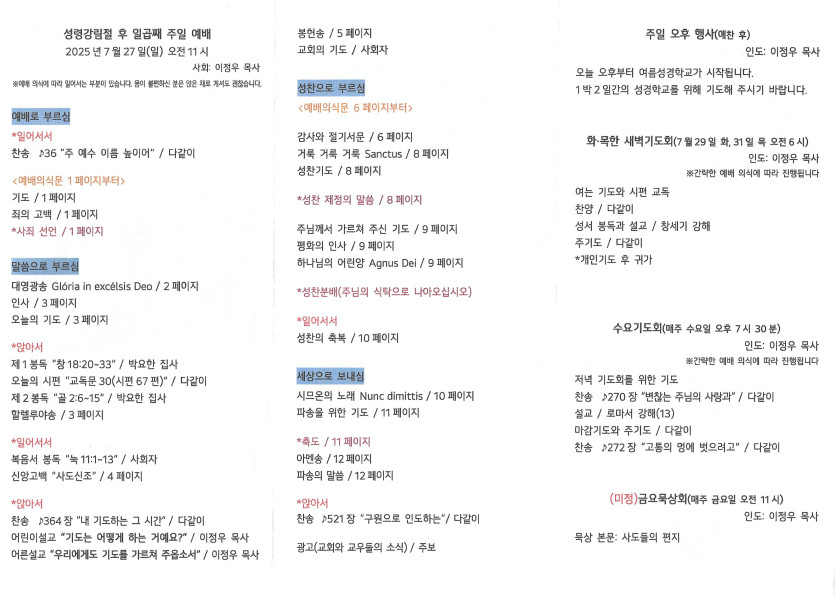 2025년 7월 27일 주보 작성자 정보 담임목사 작성 작성일 2025.08.03 22:29 컨텐츠 정보 686 조회 목록 본문 성령강림일 후 일곱째 주일 SNS 공유 관련자료 이전 2025년 8월 3일 주보 작성일 2025.08.03 22:30 다음 2025년 7월 20일 주보 작성일 2025.07.23 13:32 댓글 0 등록된 댓글이 없습니다. 로그인한 회원만 댓글 등록이 가능합니다. 목록
