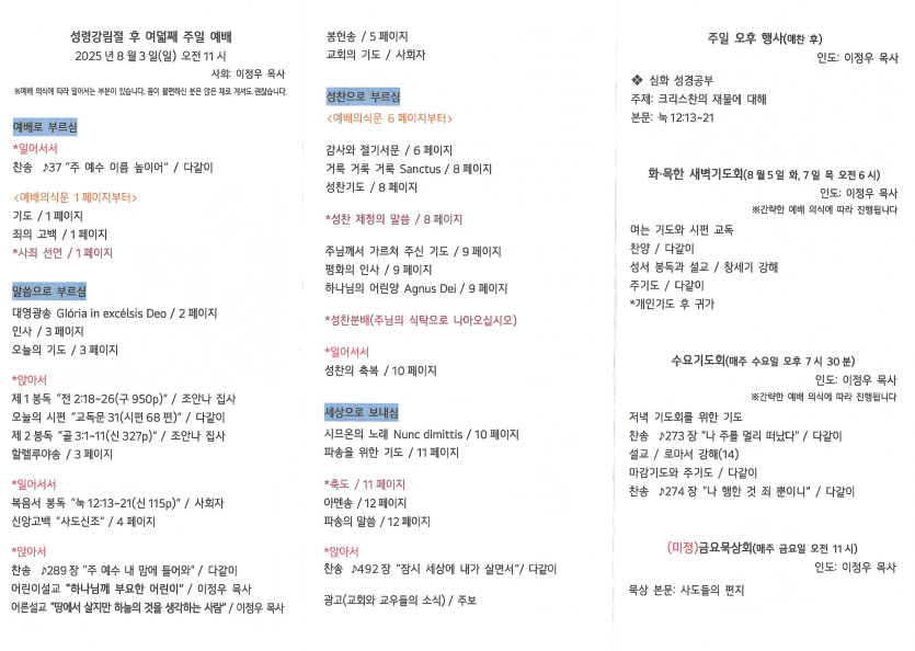 2025년 8월 3일 주보 작성자 정보 담임목사 작성 작성일 2025.08.03 22:30 컨텐츠 정보 616 조회 목록 본문 성령강림일 후 여덟째 주일 SNS 공유 관련자료 이전 2025년 8월 10일 주보 작성일 2025.08.12 16:23 다음 2025년 7월 27일 주보 작성일 2025.08.03 22:29 댓글 0 등록된 댓글이 없습니다. 로그인한 회원만 댓글 등록이 가능합니다. 목록