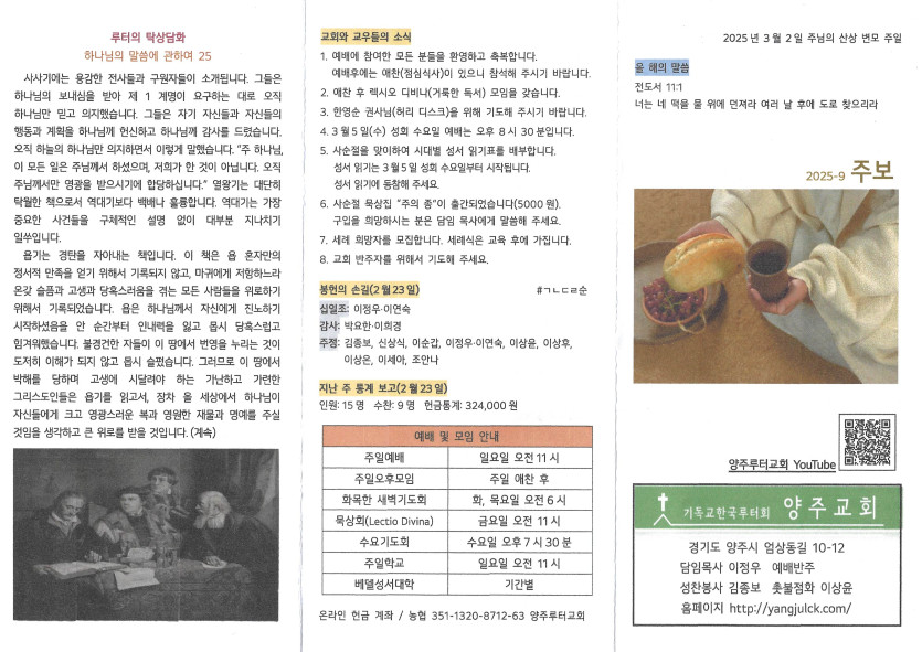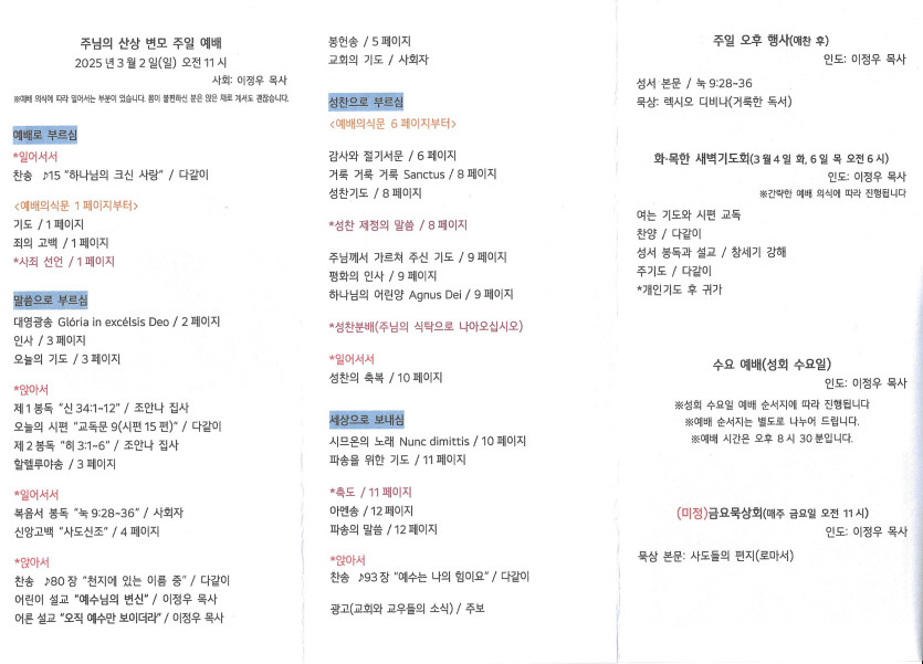 2025년 3월 2일 주보 작성자 정보 담임목사 작성 작성일 2025.03.06 12:33 컨텐츠 정보 929 조회 목록 본문 주님의 산상 변모 주일 SNS 공유 관련자료 이전 2025년 3월 9일 주보 작성일 2025.03.15 17:59 다음 2025년 2월 23일 주보 작성일 2025.03.01 21:11 댓글 0 등록된 댓글이 없습니다. 로그인한 회원만 댓글 등록이 가능합니다. 목록