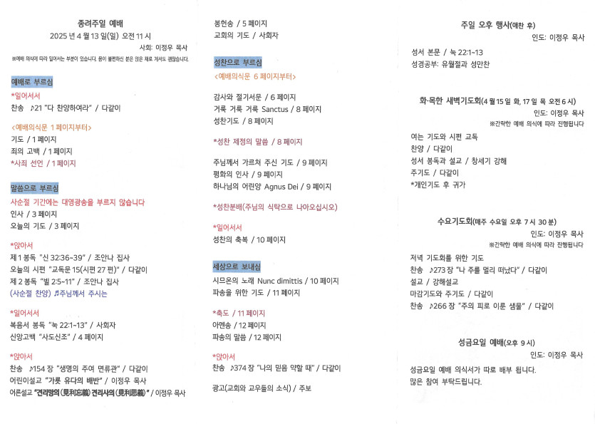2025년 4월 13일 주보 작성자 정보 담임목사 작성 작성일 2025.04.16 19:16 컨텐츠 정보 941 조회 목록 본문 종려주일 SNS 공유 관련자료 이전 2025년 4월 20일 주보 작성일 2025.04.23 14:12 다음 2025년 4월 6일 주보 작성일 2025.04.08 15:51 댓글 0 등록된 댓글이 없습니다. 로그인한 회원만 댓글 등록이 가능합니다. 목록