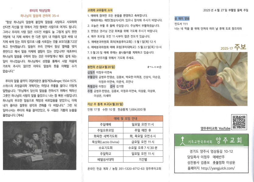 2025년 4월 27일 주보 작성자 정보 담임목사 작성 작성일 2025.05.03 00:24 컨텐츠 정보 915 조회 목록 본문 부활절 둘째 주일 SNS 공유 관련자료 이전 2025년 5월 4일 주보 작성일 2025.05.08 17:17 다음 2025년 4월 20일 주보 작성일 2025.04.23 14:12 댓글 0 등록된 댓글이 없습니다. 로그인한 회원만 댓글 등록이 가능합니다. 목록