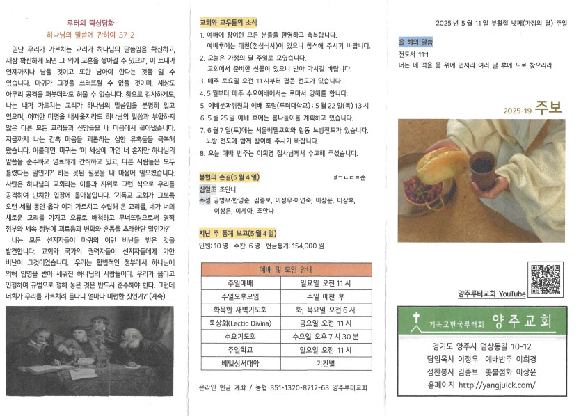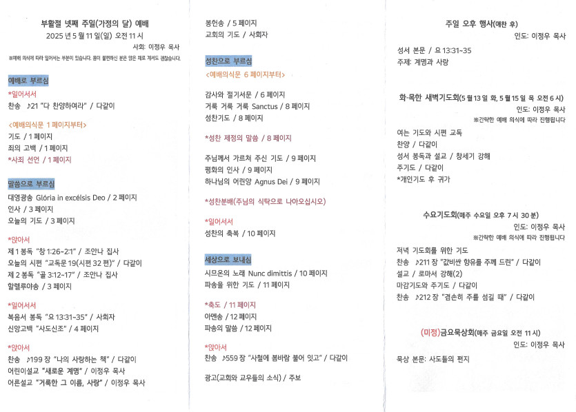 2025년 5월 11일 주보 작성자 정보 담임목사 작성 작성일 2025.05.21 10:53 컨텐츠 정보 854 조회 목록 본문 부활절 넷째 주일(가정의 달 주일) SNS 공유 관련자료 이전 2025년 5월 18일 주보 작성일 2025.05.21 10:53 다음 2025년 5월 4일 주보 작성일 2025.05.08 17:17 댓글 0 등록된 댓글이 없습니다. 로그인한 회원만 댓글 등록이 가능합니다. 목록