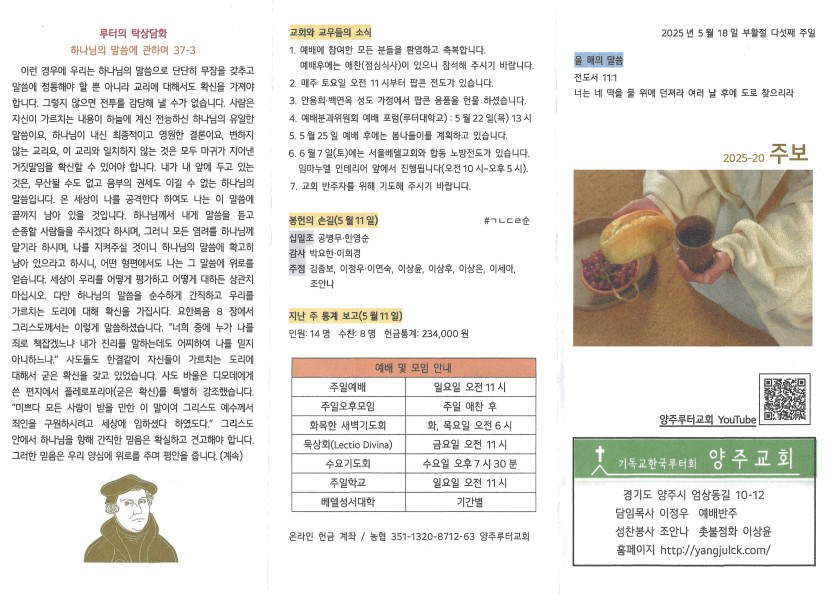 2025년 5월 18일 주보 작성자 정보 담임목사 작성 작성일 2025.05.21 10:53 컨텐츠 정보 804 조회 목록 본문 부활절 다섯째 주일 SNS 공유 관련자료 이전 2025년 5월 25일 주보 작성일 2025.05.30 00:16 다음 2025년 5월 11일 주보 작성일 2025.05.21 10:53 댓글 0 등록된 댓글이 없습니다. 로그인한 회원만 댓글 등록이 가능합니다. 목록