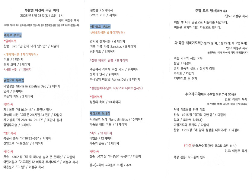 2025년 5월 25일 주보 작성자 정보 담임목사 작성 작성일 2025.05.30 00:16 컨텐츠 정보 856 조회 목록 본문 부활절 여섯째 주일 SNS 공유 관련자료 이전 2025년 6월 1일 주보 작성일 2025.06.09 14:16 다음 2025년 5월 18일 주보 작성일 2025.05.21 10:53 댓글 0 등록된 댓글이 없습니다. 로그인한 회원만 댓글 등록이 가능합니다. 목록