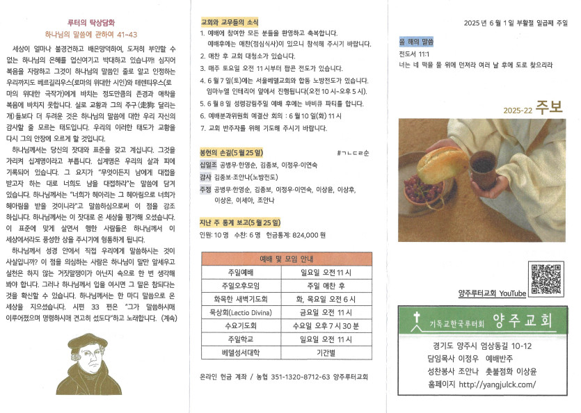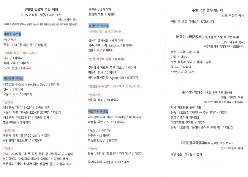 2025년 6월 1일 주보 작성자 정보 담임목사 작성 작성일 2025.06.09 14:16 컨텐츠 정보 881 조회 목록 본문 부활절 일곱째 주일 SNS 공유 관련자료 이전 2025년 6월 8일 주보 작성일 2025.06.09 14:37 다음 2025년 5월 25일 주보 작성일 2025.05.30 00:16 댓글 0 등록된 댓글이 없습니다. 로그인한 회원만 댓글 등록이 가능합니다. 목록