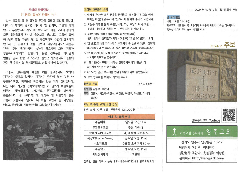 2024년 12월 8일 주보 작성자 정보 담임목사 작성 작성일 2024.12.10 22:47 컨텐츠 정보 1,032 조회 목록 본문 대림절 둘째 주일 SNS 공유 관련자료 이전 2024년 12월 15일 주보 작성일 2024.12.17 15:54 다음 2024.12.1.주보 작성일 2024.12.02 21:29 댓글 0 등록된 댓글이 없습니다. 로그인한 회원만 댓글 등록이 가능합니다. 목록