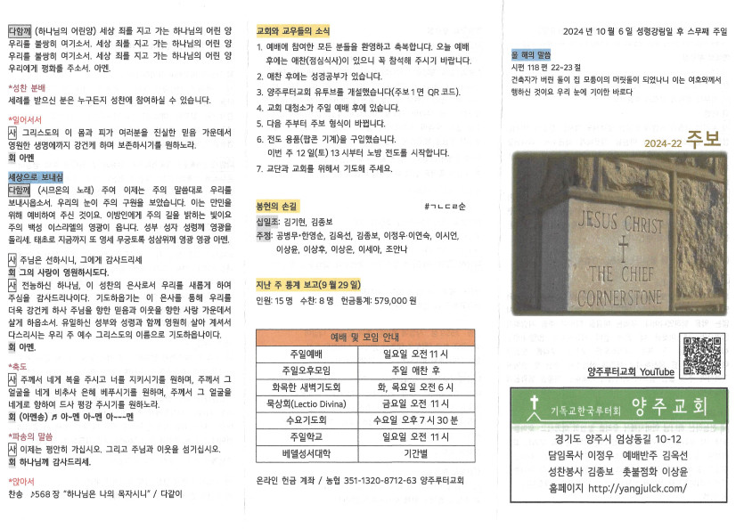 2024년 10월 6일 주일주보 작성자 정보 담임목사 작성 작성일 2024.10.08 14:31 컨텐츠 정보 1,302 조회 목록 본문 성령강림일 후 스무째주일 SNS 공유 관련자료 이전 2024년 10월 13일 주일주보 작성일 2024.10.16 15:40 다음 2024년 9월 29일 주보 작성일 2024.10.01 22:07 댓글 0 등록된 댓글이 없습니다. 로그인한 회원만 댓글 등록이 가능합니다. 목록
