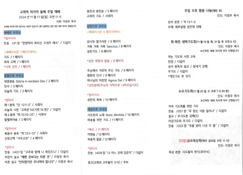 2024년 11월 17일 주보 작성자 정보 담임목사 작성 작성일 2024.11.17 20:22 컨텐츠 정보 1,199 조회 목록 본문 교회력 마지막 둘째 주일 SNS 공유 관련자료 이전 2024년11월24일 주보 작성일 2024.11.25 13:21 다음 2024년 11월10일 주보 작성일 2024.11.12 16:16 댓글 0 등록된 댓글이 없습니다. 로그인한 회원만 댓글 등록이 가능합니다. 목록