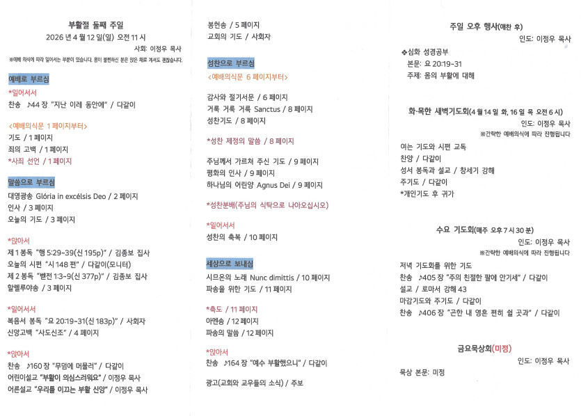 2026년 4월 12일 주보 작성자 정보 담임목사 작성 작성일 2026.04.18 00:00 컨텐츠 정보 9 조회 목록 본문 부활절 둘째 주일 SNS 공유 관련자료 다음 2026년 4월 5일 주보 작성일 2026.04.11 22:42 댓글 0 등록된 댓글이 없습니다. 로그인한 회원만 댓글 등록이 가능합니다. 목록