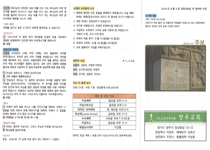 2024년 8월 4일 주보 작성자 정보 담임목사 작성 작성일 2024.08.07 19:07 컨텐츠 정보 1,140 조회 목록 본문 성령강림일 후 열한째 주일 주보 SNS 공유 관련자료 이전 2024년 8월 11일 주보 작성일 2024.08.16 19:47 다음 2024년 7월 28일 주보 작성일 2024.08.01 11:10 댓글 0 등록된 댓글이 없습니다. 로그인한 회원만 댓글 등록이 가능합니다. 목록