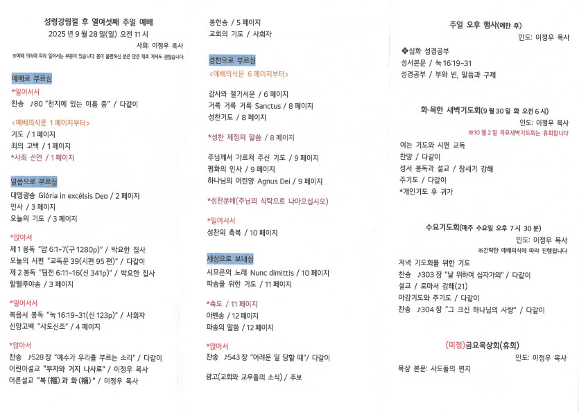 2025년 9월 28일 주보 작성자 정보 담임목사 작성 작성일 2025.10.01 15:43 컨텐츠 정보 531 조회 목록 본문 성령강림일 후 열여섯째 주일 SNS 공유 관련자료 이전 2025년 10월 5일 주보 작성일 2025.10.10 00:26 다음 2025년 9월 21일 주보 작성일 2025.09.23 16:25 댓글 0 등록된 댓글이 없습니다. 로그인한 회원만 댓글 등록이 가능합니다. 목록