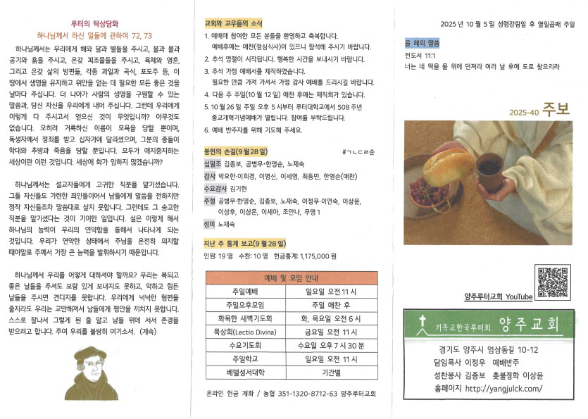 2025년 10월 5일 주보 작성자 정보 담임목사 작성 작성일 2025.10.10 00:26 컨텐츠 정보 558 조회 목록 본문 성령강림일 후 열일곱째 주일 SNS 공유 관련자료 이전 2025년 10월 12일 주보 작성일 2025.10.23 16:26 다음 2025년 9월 28일 주보 작성일 2025.10.01 15:43 댓글 0 등록된 댓글이 없습니다. 로그인한 회원만 댓글 등록이 가능합니다. 목록