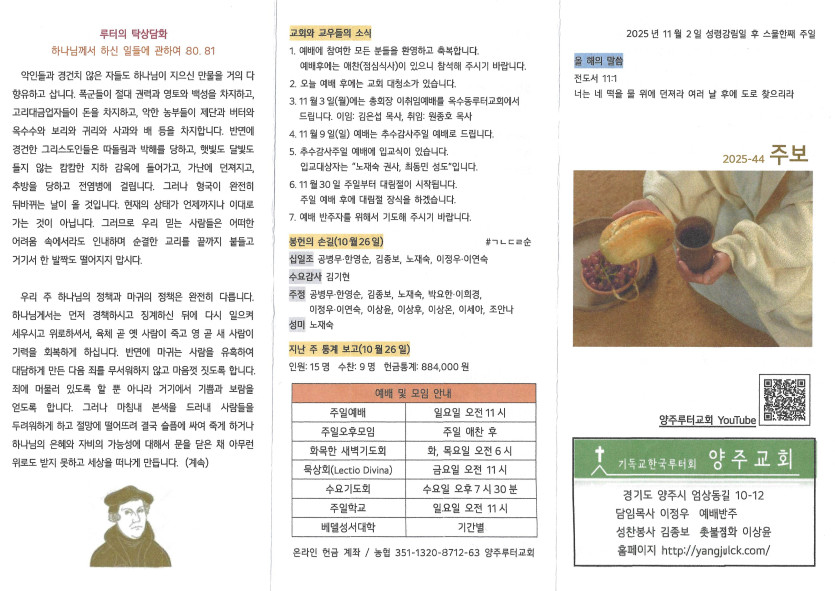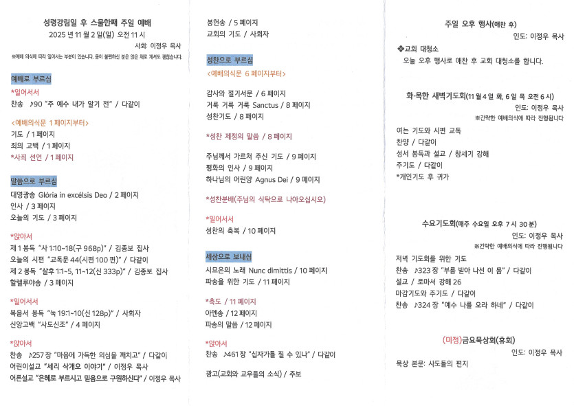 2025년 11월 2일 주보 작성자 정보 담임목사 작성 작성일 2025.11.16 00:35 컨텐츠 정보 449 조회 목록 본문 성령강림일 후 스물한째 주일 SNS 공유 관련자료 이전 2025년 11월 9일 주보 작성일 2025.11.16 00:35 다음 2025년 10월 26일 주보 작성일 2025.10.30 16:17 댓글 0 등록된 댓글이 없습니다. 로그인한 회원만 댓글 등록이 가능합니다. 목록