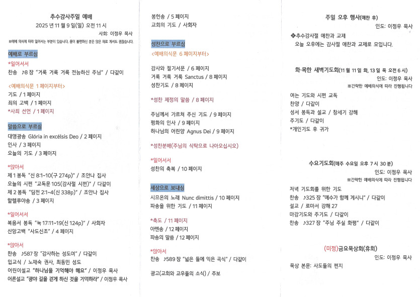 2025년 11월 9일 주보 작성자 정보 담임목사 작성 작성일 2025.11.16 00:35 컨텐츠 정보 459 조회 목록 본문 추수감사주일 SNS 공유 관련자료 이전 2025년 11월 16일 주보 작성일 2025.11.16 00:36 다음 2025년 11월 2일 주보 작성일 2025.11.16 00:35 댓글 0 등록된 댓글이 없습니다. 로그인한 회원만 댓글 등록이 가능합니다. 목록