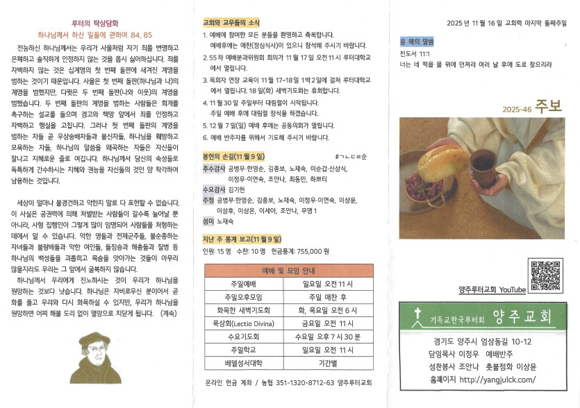 2025년 11월 16일 주보 작성자 정보 담임목사 작성 작성일 2025.11.16 00:36 컨텐츠 정보 451 조회 목록 본문 교회력 마지막 둘째 주일 SNS 공유 관련자료 이전 2025년 11월 23일 주보 작성일 2025.11.25 16:18 다음 2025년 11월 9일 주보 작성일 2025.11.16 00:35 댓글 0 등록된 댓글이 없습니다. 로그인한 회원만 댓글 등록이 가능합니다. 목록