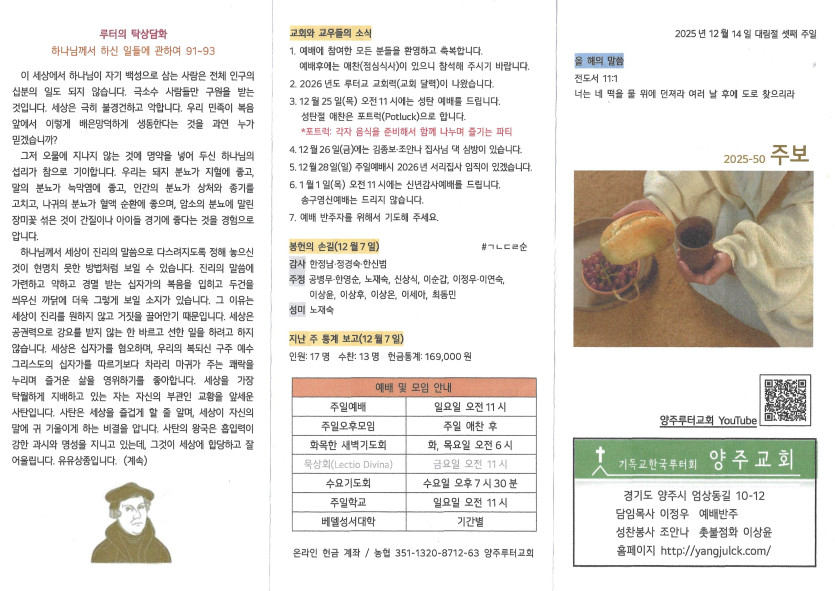 2025년 12월 14일 주보 작성자 정보 담임목사 작성 작성일 2025.12.16 16:17 컨텐츠 정보 333 조회 목록 본문 대림절 셋째 주일 SNS 공유 관련자료 이전 2025년 12월 21일 주보 작성일 2025.12.28 23:58 다음 2025년 12월 7일 작성일 2025.12.13 13:11 댓글 0 등록된 댓글이 없습니다. 로그인한 회원만 댓글 등록이 가능합니다. 목록