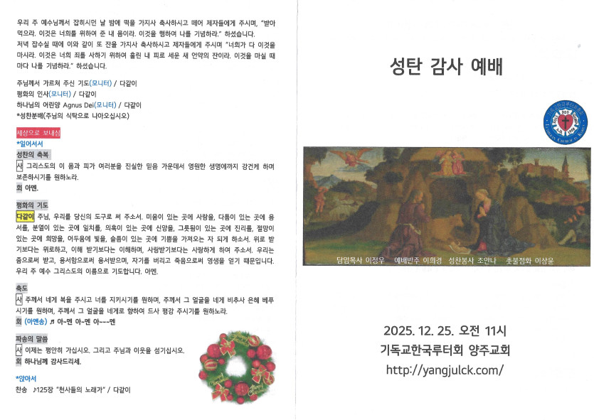 2025년 12월 25일 주보 작성자 정보 담임목사 작성 작성일 2025.12.29 00:17 컨텐츠 정보 317 조회 목록 본문 성탄절 SNS 공유 관련자료 이전 2025년 12월 28일 주보 작성일 2025.12.29 00:21 다음 2025년 12월 21일 주보 작성일 2025.12.28 23:58 댓글 0 등록된 댓글이 없습니다. 로그인한 회원만 댓글 등록이 가능합니다. 목록
