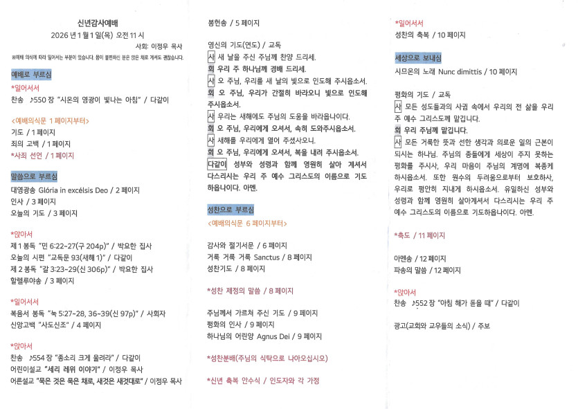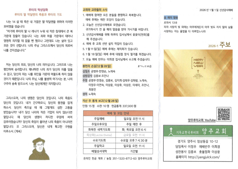2026년 1월 1일 주보 작성자 정보 담임목사 작성 작성일 2026.01.07 23:32 컨텐츠 정보 201 조회 목록 본문 신년감사예배 SNS 공유 관련자료 이전 2026년 1월 4일 주보 작성일 2026.01.07 23:32 다음 2025년 12월 28일 주보 작성일 2025.12.29 00:21 댓글 0 등록된 댓글이 없습니다. 로그인한 회원만 댓글 등록이 가능합니다. 목록