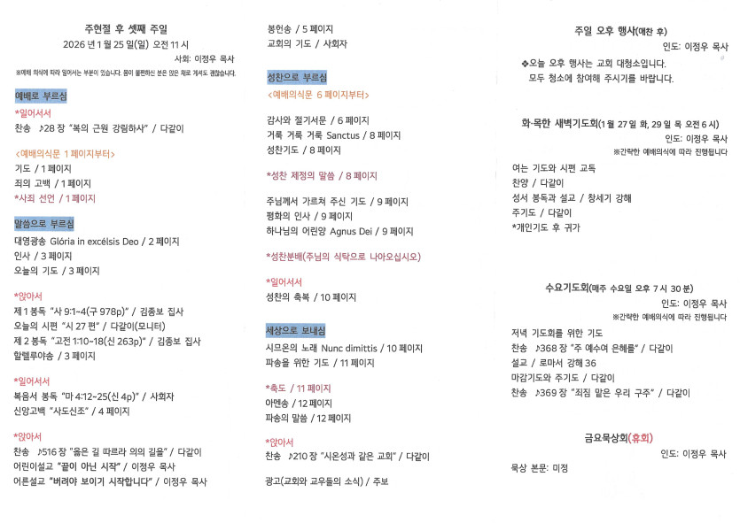 2026년 1월 25일 주보 작성자 정보 담임목사 작성 작성일 2026.01.31 20:36 컨텐츠 정보 189 조회 목록 본문 주현절 후 셋째 주일 SNS 공유 관련자료 이전 2026년 2월 1일 주보 작성일 2026.02.07 18:10 다음 2026년 1월 18일 주보 작성일 2026.01.20 16:12 댓글 0 등록된 댓글이 없습니다. 로그인한 회원만 댓글 등록이 가능합니다. 목록