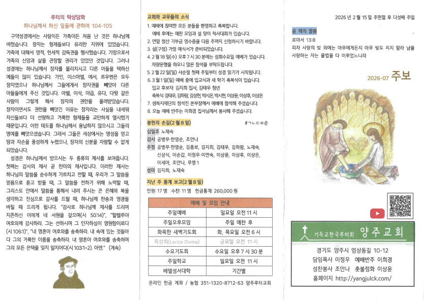 2026년 2월 15일 주보 작성자 정보 담임목사 작성 작성일 2026.02.18 15:35 컨텐츠 정보 157 조회 목록 본문 산상변모주일 SNS 공유 관련자료 이전 2026 설(구정)가정 예식서 작성일 2026.02.18 15:35 다음 2026년 2월 8일 주보 작성일 2026.02.14 00:55 댓글 0 등록된 댓글이 없습니다. 로그인한 회원만 댓글 등록이 가능합니다. 목록