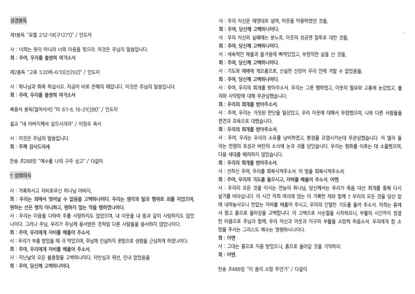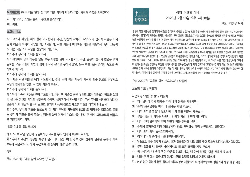 2026년 성회수요일 주보(2.18.) 작성자 정보 담임목사 작성 작성일 2026.02.24 14:52 컨텐츠 정보 132 조회 목록 본문 성회 수요일 SNS 공유 관련자료 이전 2026년 2월 22일 주보 작성일 2026.02.24 14:52 다음 2026 설(구정)가정 예식서 작성일 2026.02.18 15:35 댓글 0 등록된 댓글이 없습니다. 로그인한 회원만 댓글 등록이 가능합니다. 목록