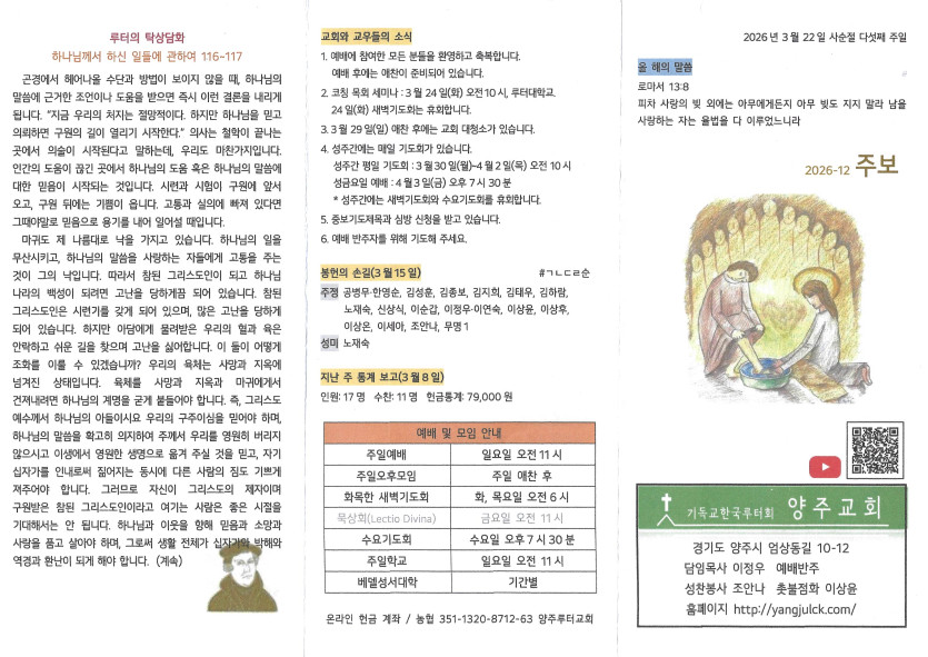 2026년 3월 22일 주보 작성자 정보 담임목사 작성 작성일 2026.03.26 15:52 컨텐츠 정보 51 조회 목록 본문 사순절 다섯째 주일 SNS 공유 관련자료 다음 2026년 3월 15일 주보 작성일 2026.03.17 16:25 댓글 0 등록된 댓글이 없습니다. 로그인한 회원만 댓글 등록이 가능합니다. 목록