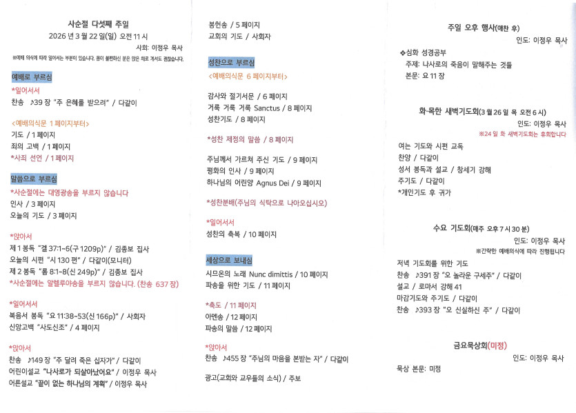2026년 3월 22일 주보 작성자 정보 담임목사 작성 작성일 2026.03.26 15:52 컨텐츠 정보 42 조회 목록 본문 사순절 다섯째 주일 SNS 공유 관련자료 다음 2026년 3월 15일 주보 작성일 2026.03.17 16:25 댓글 0 등록된 댓글이 없습니다. 로그인한 회원만 댓글 등록이 가능합니다. 목록
