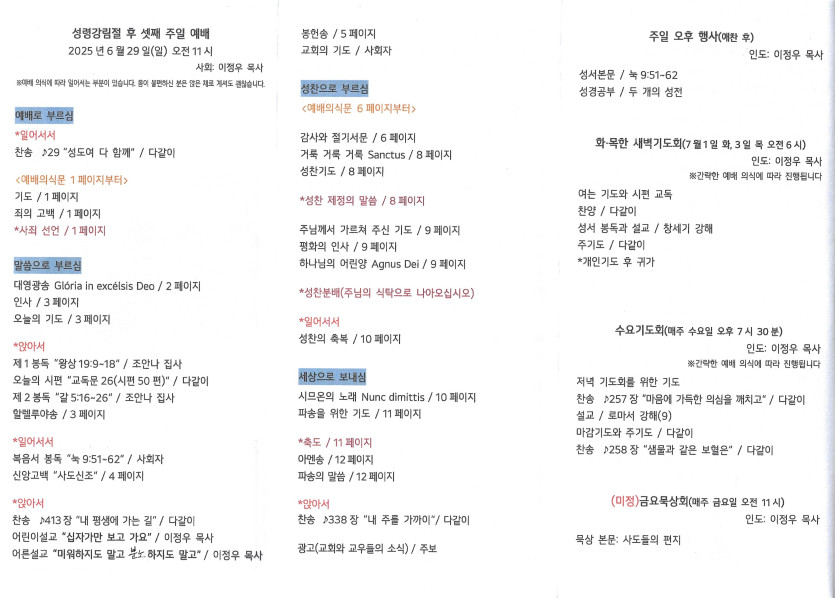 2025년 6월 29일 주보 작성자 정보 담임목사 작성 작성일 2025.07.01 15:56 컨텐츠 정보 809 조회 목록 본문 성령강림일 후 셋째 주일 SNS 공유 관련자료 이전 2025년 7월 6일 주보 작성일 2025.07.09 13:50 다음 2025년 6월 22일 주보 작성일 2025.06.24 14:55 댓글 0 등록된 댓글이 없습니다. 로그인한 회원만 댓글 등록이 가능합니다. 목록