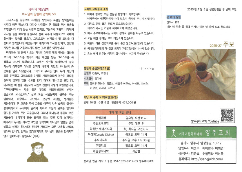 2025년 7월 6일 주보 작성자 정보 담임목사 작성 작성일 2025.07.09 13:50 컨텐츠 정보 707 조회 목록 본문 성령강림일 후 넷째 주일 SNS 공유 관련자료 이전 2025년 7월 13일 주보 작성일 2025.07.16 16:14 다음 2025년 6월 29일 주보 작성일 2025.07.01 15:56 댓글 0 등록된 댓글이 없습니다. 로그인한 회원만 댓글 등록이 가능합니다. 목록