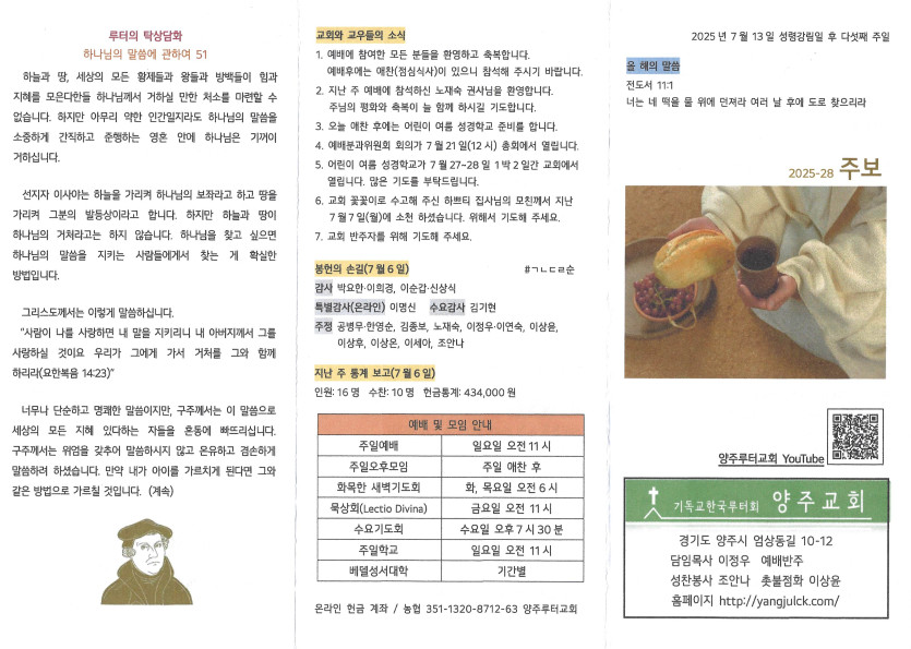 2025년 7월 13일 주보 작성자 정보 담임목사 작성 작성일 2025.07.16 16:14 컨텐츠 정보 674 조회 목록 본문 성령강림일 후 다섯째 주일 SNS 공유 관련자료 이전 2025년 7월 20일 주보 작성일 2025.07.23 13:32 다음 2025년 7월 6일 주보 작성일 2025.07.09 13:50 댓글 0 등록된 댓글이 없습니다. 로그인한 회원만 댓글 등록이 가능합니다. 목록