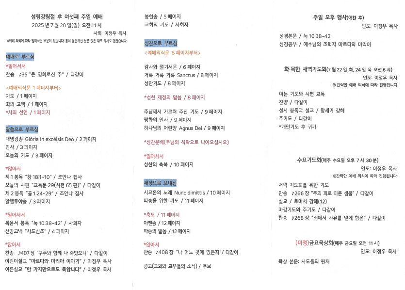 2025년 7월 20일 주보 작성자 정보 담임목사 작성 작성일 2025.07.23 13:32 컨텐츠 정보 732 조회 목록 본문 성령강림일 후 여섯째 주일 SNS 공유 관련자료 이전 2025년 7월 27일 주보 작성일 2025.08.03 22:29 다음 2025년 7월 13일 주보 작성일 2025.07.16 16:14 댓글 0 등록된 댓글이 없습니다. 로그인한 회원만 댓글 등록이 가능합니다. 목록