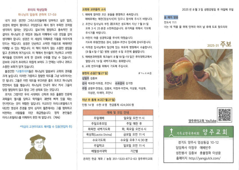 2025년 8월 3일 주보 작성자 정보 담임목사 작성 작성일 2025.08.03 22:30 컨텐츠 정보 610 조회 목록 본문 성령강림일 후 여덟째 주일 SNS 공유 관련자료 이전 2025년 8월 10일 주보 작성일 2025.08.12 16:23 다음 2025년 7월 27일 주보 작성일 2025.08.03 22:29 댓글 0 등록된 댓글이 없습니다. 로그인한 회원만 댓글 등록이 가능합니다. 목록