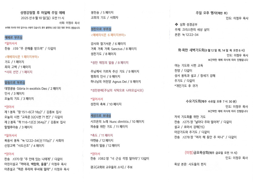 2025년 8월 10일 주보 작성자 정보 담임목사 작성 작성일 2025.08.12 16:23 컨텐츠 정보 632 조회 목록 본문 성령강림일 후 아홉째 주일 SNS 공유 관련자료 이전 2025년 8월 17일 주보 작성일 2025.08.22 17:20 다음 2025년 8월 3일 주보 작성일 2025.08.03 22:30 댓글 0 등록된 댓글이 없습니다. 로그인한 회원만 댓글 등록이 가능합니다. 목록