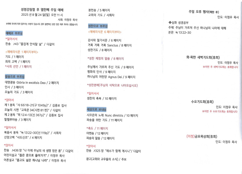 2025년 8월 24일 주보 작성자 정보 담임목사 작성 작성일 2025.08.30 00:07 컨텐츠 정보 701 조회 목록 본문 성령강림일 후 열한째 주일 SNS 공유 관련자료 이전 2025년 8월 31일 주보 작성일 2025.09.02 16:34 다음 2025년 8월 17일 주보 작성일 2025.08.22 17:20 댓글 0 등록된 댓글이 없습니다. 로그인한 회원만 댓글 등록이 가능합니다. 목록