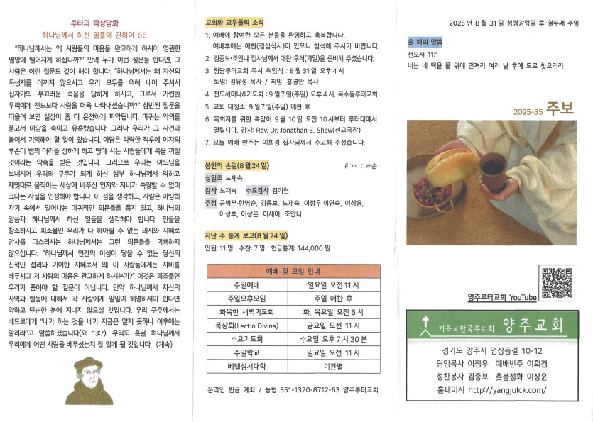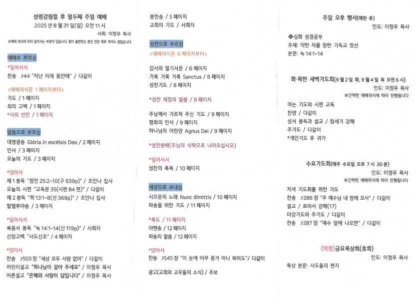 2025년 8월 31일 주보 작성자 정보 담임목사 작성 작성일 2025.09.02 16:34 컨텐츠 정보 593 조회 목록 본문 성령강림일 후 열두째 주일 SNS 공유 관련자료 이전 2025년 9월 7일 주보 작성일 2025.09.09 16:21 다음 2025년 8월 24일 주보 작성일 2025.08.30 00:07 댓글 0 등록된 댓글이 없습니다. 로그인한 회원만 댓글 등록이 가능합니다. 목록