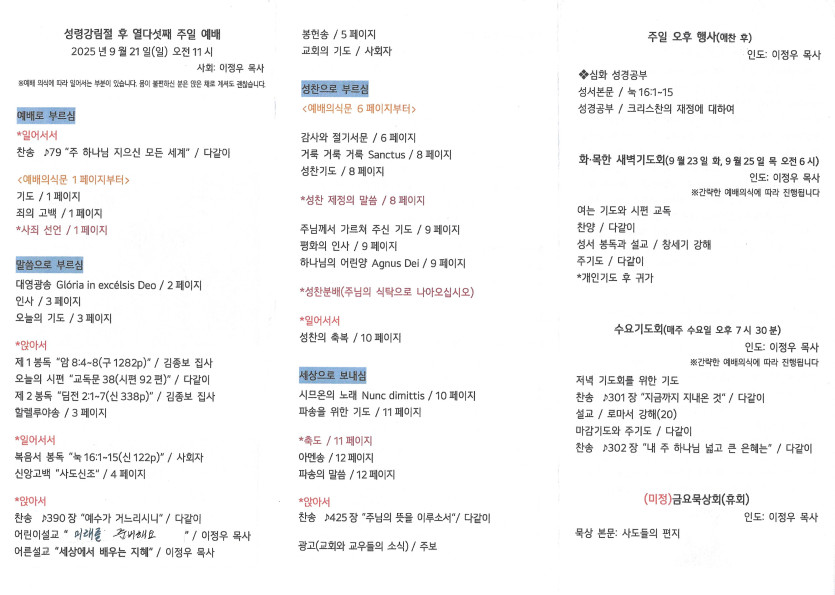 2025년 9월 21일 주보 작성자 정보 담임목사 작성 작성일 2025.09.23 16:25 컨텐츠 정보 580 조회 목록 본문 성경강림일 후 열다섯번째 주일 SNS 공유 관련자료 이전 2025년 9월 28일 주보 작성일 2025.10.01 15:43 다음 2025년 9월 14일 주보 작성일 2025.09.16 16:11 댓글 0 등록된 댓글이 없습니다. 로그인한 회원만 댓글 등록이 가능합니다. 목록