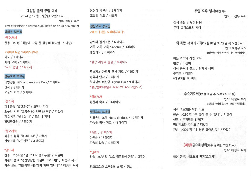 2024년 12월 8일 주보 작성자 정보 담임목사 작성 작성일 2024.12.10 22:47 컨텐츠 정보 1,028 조회 목록 본문 대림절 둘째 주일 SNS 공유 관련자료 이전 2024년 12월 15일 주보 작성일 2024.12.17 15:54 다음 2024.12.1.주보 작성일 2024.12.02 21:29 댓글 0 등록된 댓글이 없습니다. 로그인한 회원만 댓글 등록이 가능합니다. 목록