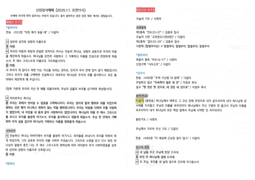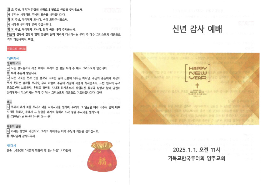 2025년 1월 1일 예배순서지 작성자 정보 담임목사 작성 작성일 2025.01.01 19:42 컨텐츠 정보 1,016 조회 목록 본문 신년감사예배 SNS 공유 관련자료 이전 2025년 1월 5일 주보 작성일 2025.01.07 21:47 다음 2024년 12월 29일 주보 작성일 2025.01.01 19:40 댓글 0 등록된 댓글이 없습니다. 로그인한 회원만 댓글 등록이 가능합니다. 목록