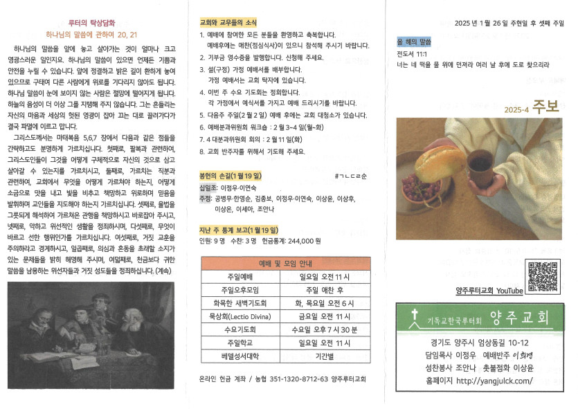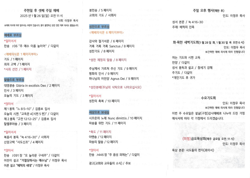 2025년1월26일 주보 작성자 정보 담임목사 작성 작성일 2025.01.26 20:33 컨텐츠 정보 997 조회 목록 본문 주현일 후 셋째 주일 SNS 공유 관련자료 이전 2025년 2월 2일 주보 작성일 2025.02.06 16:51 다음 2025년 1월 19일 주보 작성일 2025.01.19 20:02 댓글 0 등록된 댓글이 없습니다. 로그인한 회원만 댓글 등록이 가능합니다. 목록