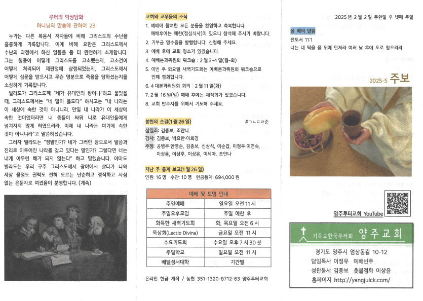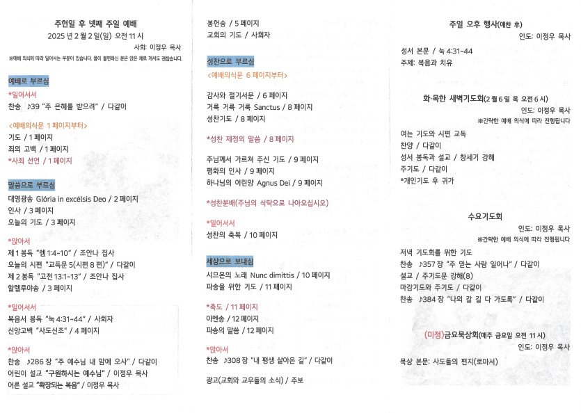 2025년 2월 2일 주보 작성자 정보 담임목사 작성 작성일 2025.02.06 16:51 컨텐츠 정보 1,008 조회 목록 본문 주현일 후 넷째 주일 SNS 공유 관련자료 이전 2025년 2월 9일 주보 작성일 2025.02.09 21:11 다음 2025년1월26일 주보 작성일 2025.01.26 20:33 댓글 0 등록된 댓글이 없습니다. 로그인한 회원만 댓글 등록이 가능합니다. 목록