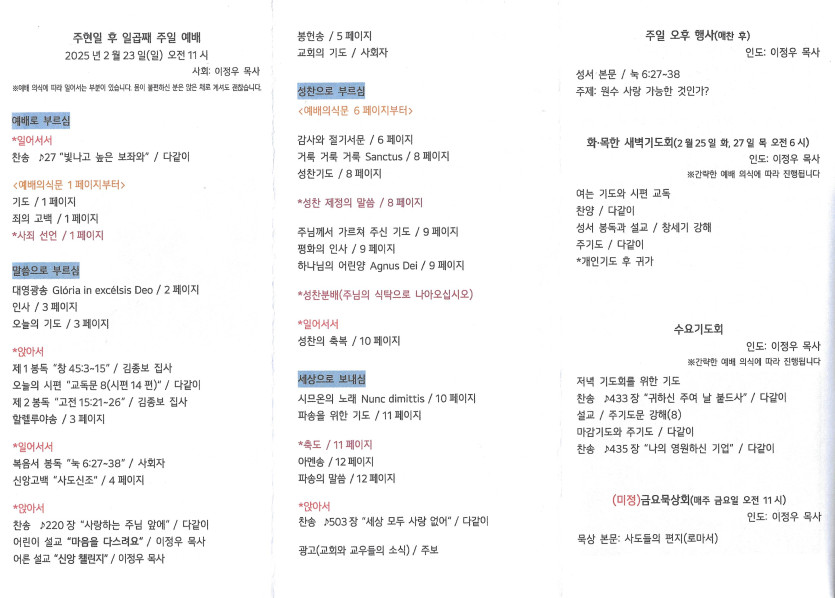 2025년 2월 23일 주보 작성자 정보 담임목사 작성 작성일 2025.03.01 21:11 컨텐츠 정보 924 조회 목록 본문 주현일 후 일곱째 주일 SNS 공유 관련자료 이전 2025년 3월 2일 주보 작성일 2025.03.06 12:33 다음 2025년2월16일 주보 작성일 2025.02.17 20:09 댓글 0 등록된 댓글이 없습니다. 로그인한 회원만 댓글 등록이 가능합니다. 목록