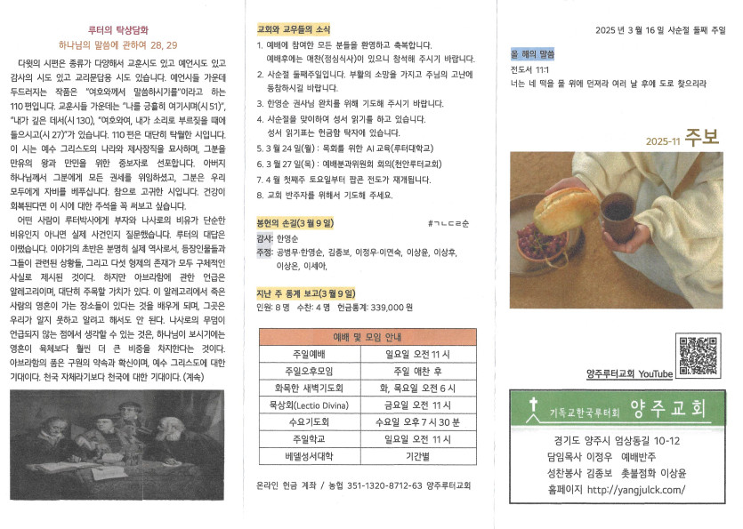 2025년 3월 16일 주보 작성자 정보 담임목사 작성 작성일 2025.03.18 14:11 컨텐츠 정보 879 조회 목록 본문 사순절 둘째 주일 SNS 공유 관련자료 이전 2025년 3월 23일 주보 작성일 2025.03.25 14:08 다음 2025년 3월 9일 주보 작성일 2025.03.15 17:59 댓글 0 등록된 댓글이 없습니다. 로그인한 회원만 댓글 등록이 가능합니다. 목록