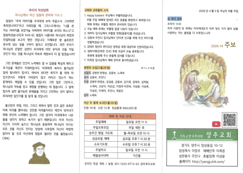 2026년 4월 5일 주보 작성자 정보 담임목사 작성 작성일 2026.04.11 22:42 컨텐츠 정보 3 조회 목록 본문 주님의 부활 주일 SNS 공유 관련자료 다음 2026년 3월 29일 주보 작성일 2026.04.11 22:42 댓글 0 등록된 댓글이 없습니다. 로그인한 회원만 댓글 등록이 가능합니다. 목록
