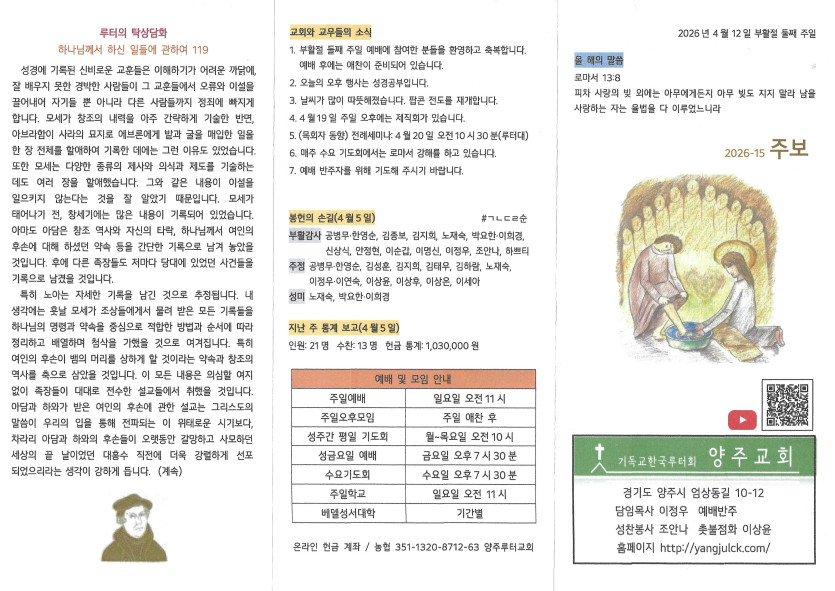 2026년 4월 12일 주보 작성자 정보 담임목사 작성 작성일 2026.04.18 00:00 컨텐츠 정보 4 조회 목록 본문 부활절 둘째 주일 SNS 공유 관련자료 다음 2026년 4월 5일 주보 작성일 2026.04.11 22:42 댓글 0 등록된 댓글이 없습니다. 로그인한 회원만 댓글 등록이 가능합니다. 목록