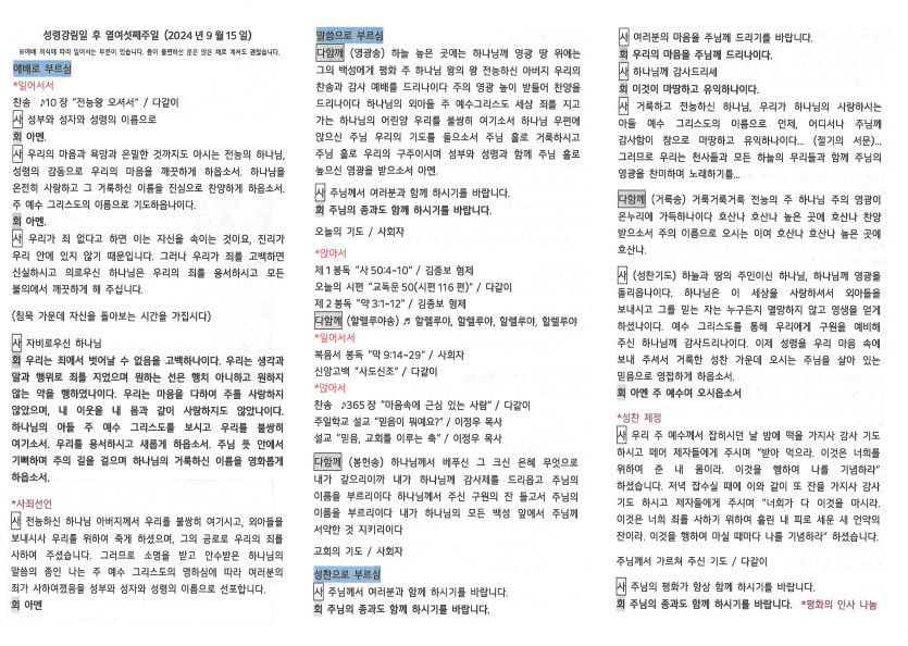 2024년 9월 15일 주보 작성자 정보 담임목사 작성 작성일 2024.09.18 13:51 컨텐츠 정보 1,200 조회 목록 본문 성령강림일 후 열일곱번째 주일 SNS 공유 관련자료 이전 2024년 9월 22일 주보 작성일 2024.09.25 13:30 다음 2024년 9월 8일 주보 작성일 2024.09.10 18:31 댓글 0 등록된 댓글이 없습니다. 로그인한 회원만 댓글 등록이 가능합니다. 목록