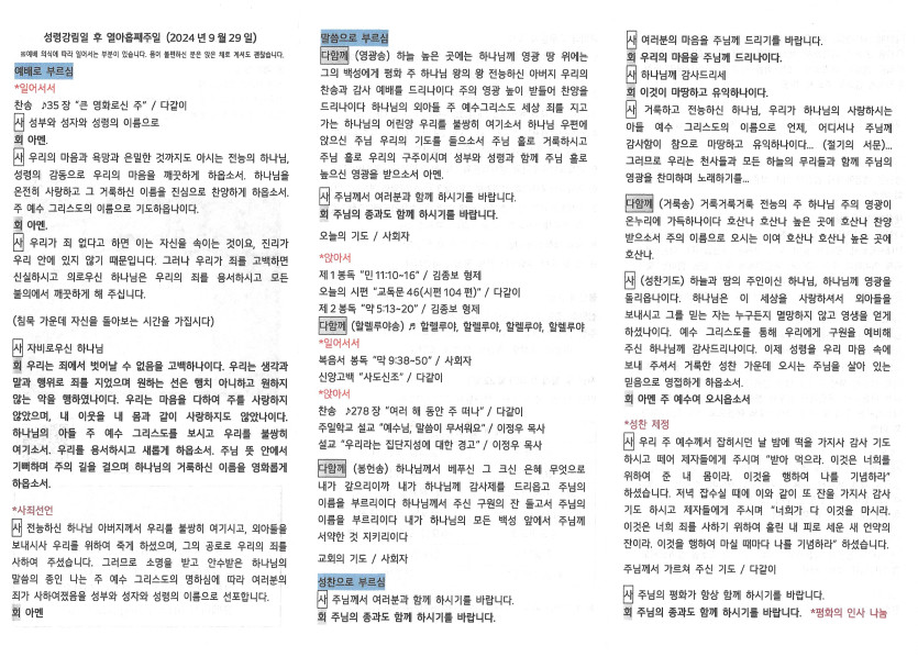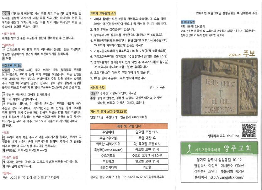 2024년 9월 29일 주보 작성자 정보 담임목사 작성 작성일 2024.10.01 22:07 컨텐츠 정보 1,185 조회 목록 본문 성령강림일 후 열아홉째 주일 SNS 공유 관련자료 이전 2024년 10월 6일 주일주보 작성일 2024.10.08 14:31 다음 2024년 9월 22일 주보 작성일 2024.09.25 13:30 댓글 0 등록된 댓글이 없습니다. 로그인한 회원만 댓글 등록이 가능합니다. 목록