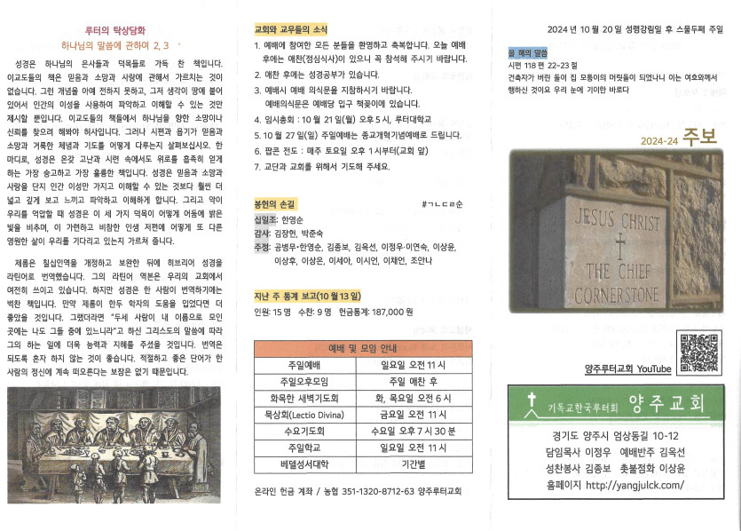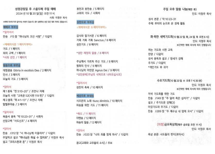 2024년 10월 20일 주일예배주보 작성자 정보 담임목사 작성 작성일 2024.10.23 11:31 컨텐츠 정보 1,267 조회 목록 본문 성령강림일 후 스물두째주일 SNS 공유 관련자료 이전 2024년 10월 27일 주보 작성일 2024.10.30 23:17 다음 2024년 10월 13일 주일주보 작성일 2024.10.16 15:40 댓글 0 등록된 댓글이 없습니다. 로그인한 회원만 댓글 등록이 가능합니다. 목록